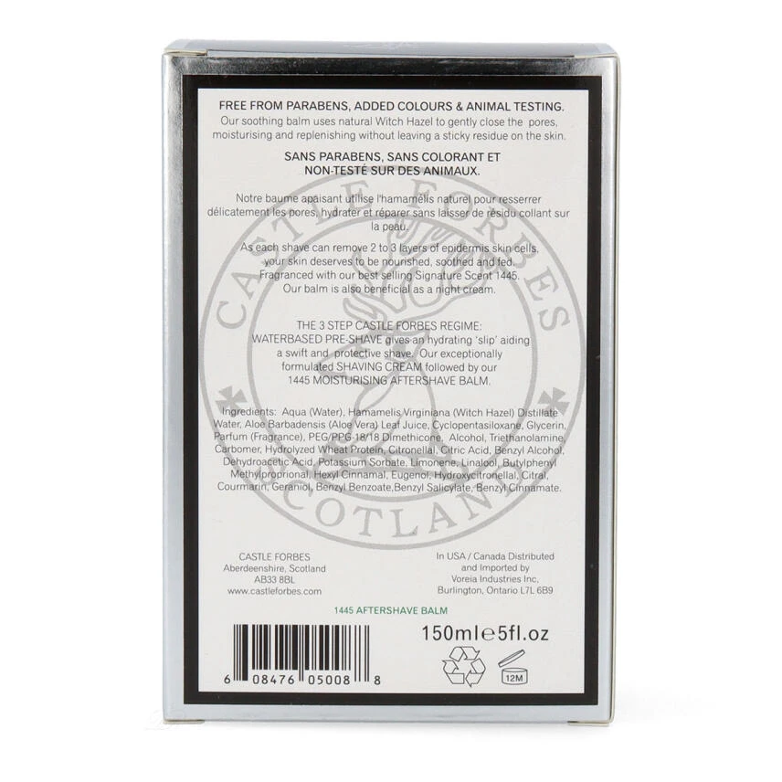 Frische & Pflege! Der 1445 After Shave Balsam von Castle Forbes enthält den charakterisitischen Duft von Castle Forbes 1445, einem frischen Fougère Duft, der sauber und maskulin ist. Der alkoholfreie After Shave Balsam enthält Hamamelis, um die Poren zu straffen und die Haut zu beruhigen. Er spendet Feuchtigkeit und pflegt die Haut, ohne klebrige oder ölige Rückstände zu hinterlassen. Der Balsam eignet sich auch hervorragend als Nachtcreme.