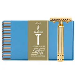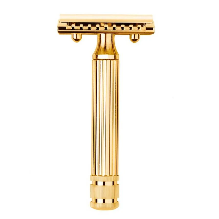 Der Fatip Klassiker in Gold für eine sanfte Rasur! Der Grande Safety Razor von Fatip ist ein hohler, leichtgewichtiger 3-teiliger Sicherheitsrasierer, der ausbalanciert und einfach zu bedienen ist. Er verfügt über Paspel-Details am Griff, ein poliertes Gold-Finish und einen geschlossenen Kamm für eine sanfte Rasur. Der Gold Metal Grande Rasierapparat ist ein stylischer, funktionaler Rasierer zu einem günstigen Preis.dambiro