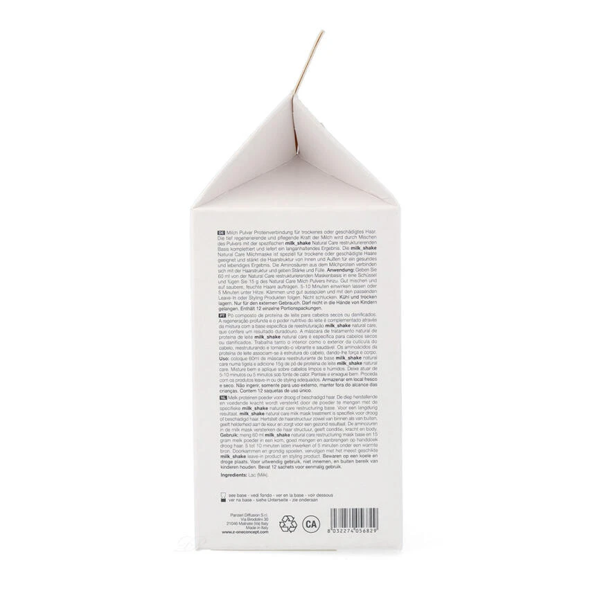 - Die Basisemulsion „milk_shake Mask Base“ kann mit allen Pulvermasken der Natural Care Serie kombiniert werden