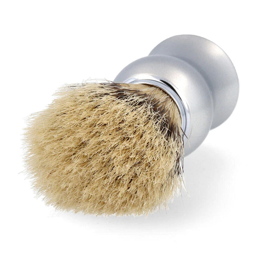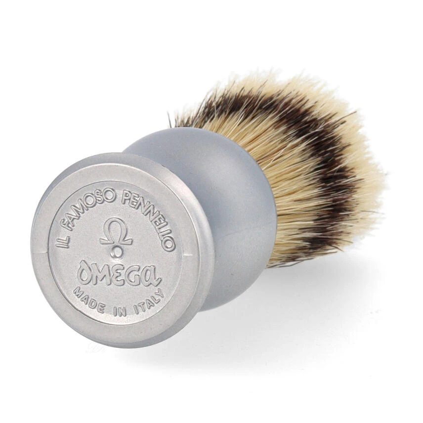 Omega Rasierpinsel mit Dachshaar-Effekt aus reinen Borsten mit satiniertem Kunststoffgriff.