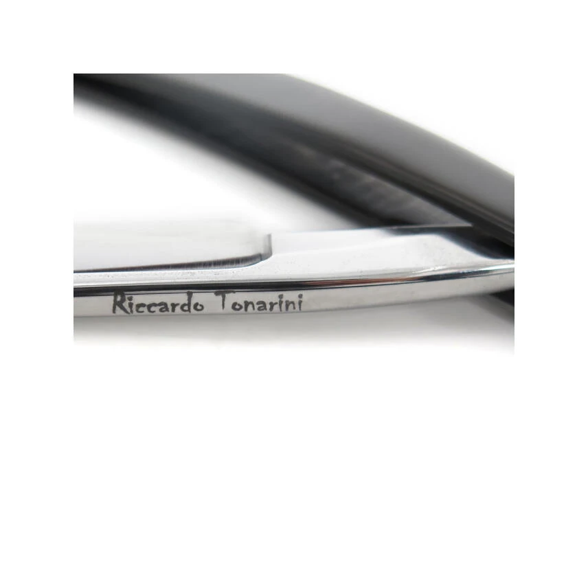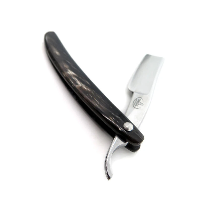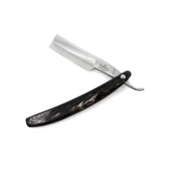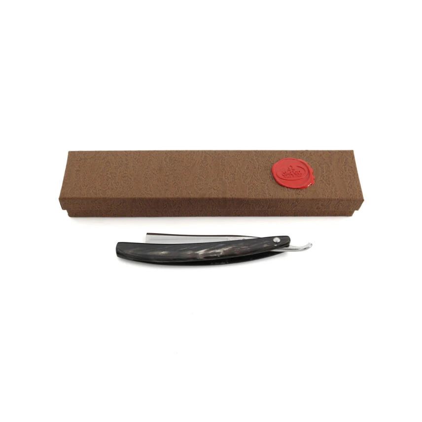 7/8-Klinge mit gerader Spitze (quadratisch) und ¼ Hohlschliff, geschmiedet und handgefertigt in Kohlenstoffstahl mit einer speziellen Zusammensetzung, definiert von seinem Schöpfer RTL18 (Sheffield-Stahl, geeignet modifiziert, um Nickel und andere Mineralien auszuschließen, um die Glätte zu verbessern , Kantenlebensdauer und einfaches Schärfen sicherstellen).
